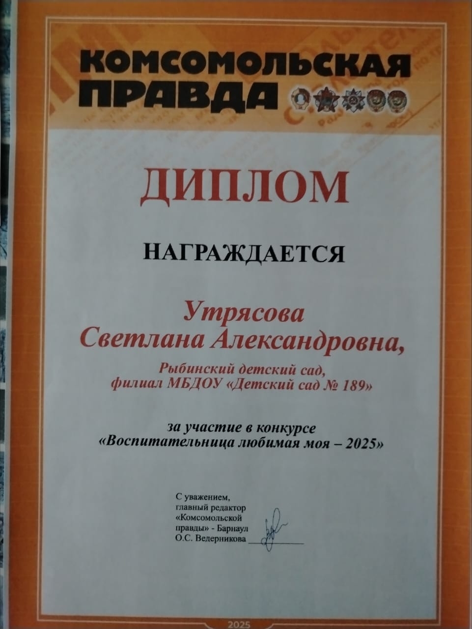 Персональный сайт воспитателя Рыбинского детского сада, филиала МБДОУ "Детский сад №189" Утрясовой Светланы Александровны
